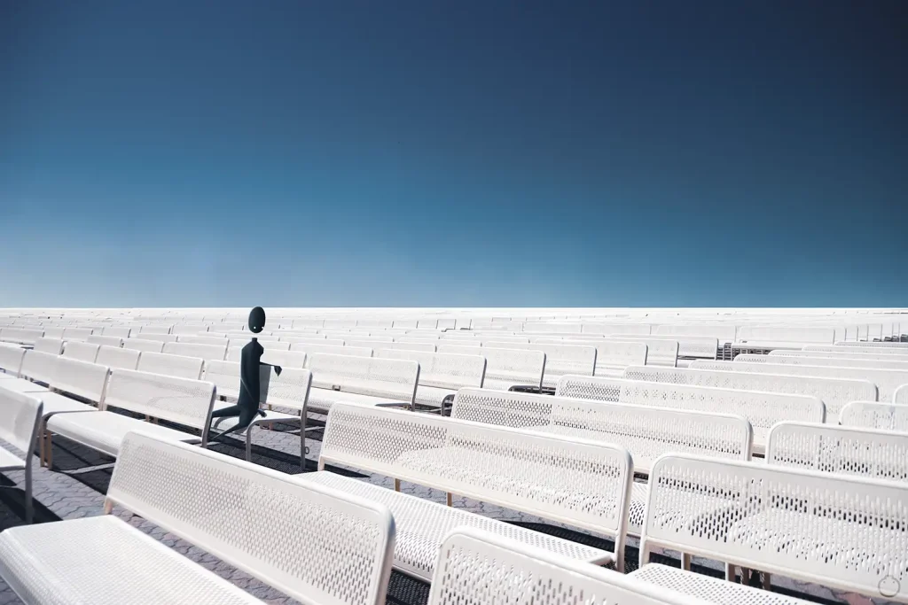Each piece begins with a photograph of a real location. Buildings left to rot, fields frozen in time. Then a small, cartoonish character is added in post, wandering alone, pausing mid-journey to wonder if they’ve been here before or if they’re lost. The work carries a matured ‘Oh, The Places You’ll Go’ vibe, echoing the quiet melancholy of The Waiting Place where you’re meant to keep moving but can’t quite figure out which direction to go or where you’ll fit in. There’s also a touch of Edward Gorey in the snapshot-like compositions: moments frozen in time, darkly whimsical yet humanly sad. And the isolated stillness of Edward Hopper’s surreal works, where loneliness lives in geometry and light.